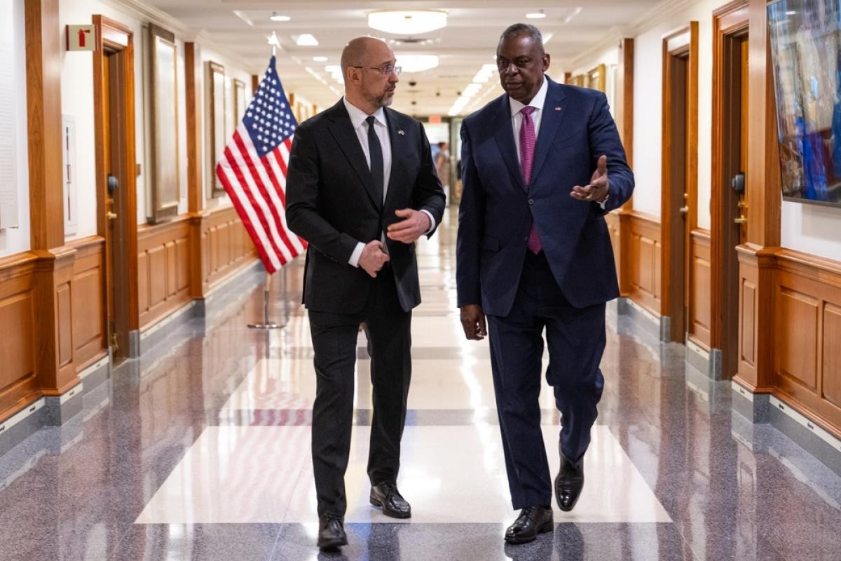 Thủ tướng Ukraine Denys Shmyhal (trái) và Bộ trưởng Quốc phòng Mỹ Lloyd Austin. (Ảnh: Bộ Quốc phòng Mỹ)