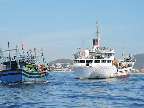 | Tàu HQ 629 lai dắt tàu cá ngư dân Bình Định bị nạn tại Hoàng Sa về đảo Lý Sơn |