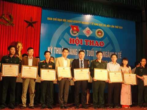 | Kỹ sư Đặng Đức Hạnh (đứng giữa) thay mặt nhóm kỹ thuật nhận bằng Giải nhất đề tài công nghệ thông tin trong Hội thao Kỹ thuật năm 2013. |