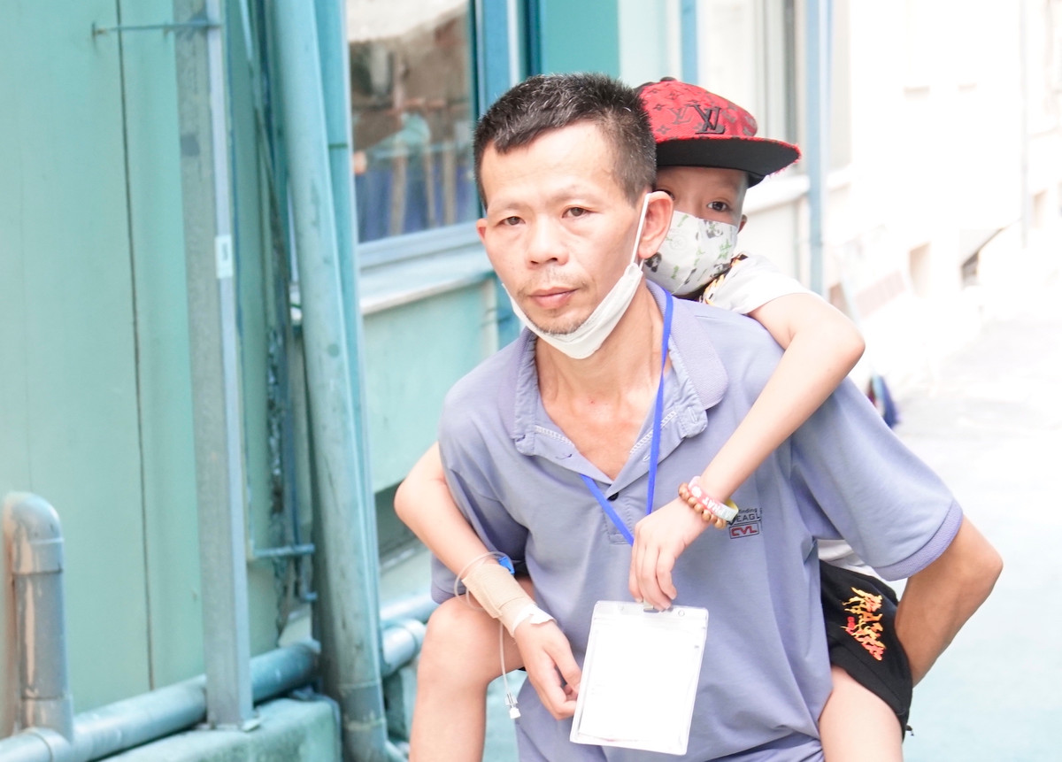 Sáng 29/5, anh Phạm Hồng Hà (46 tuổi ở xã Sơn Long, Hương Sơn, Hà Tĩnh) cõng con trai Phạm Thành Nam từ phòng 602 khoa H6 xuống sảnh chính nhà H Viện Huyết học truyền máu Trung ương, Hà Nội đi lại cho khuây khoả. Nam vừa truyền xong hoá chất, cậu bé mệt mỏi nằm trên vai bố.