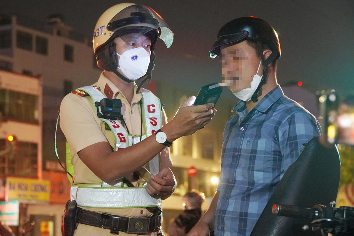 Cùng lúc, anh H.T.M. (37 tuổi) trên đường đi đá bóng về cũng bị CSGT dừng xe kiểm tra. Anh này có nồng độ cồn mức 0,205 mg/l khí thở.