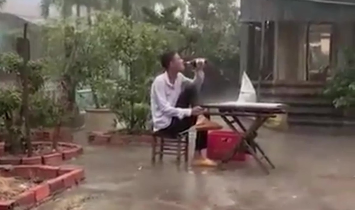 Đang ngồi giải sầu dưới cơn mưa to, thanh niên giật bắn mình phun cả bia ra ngoài vì sét đánh xuống sân.