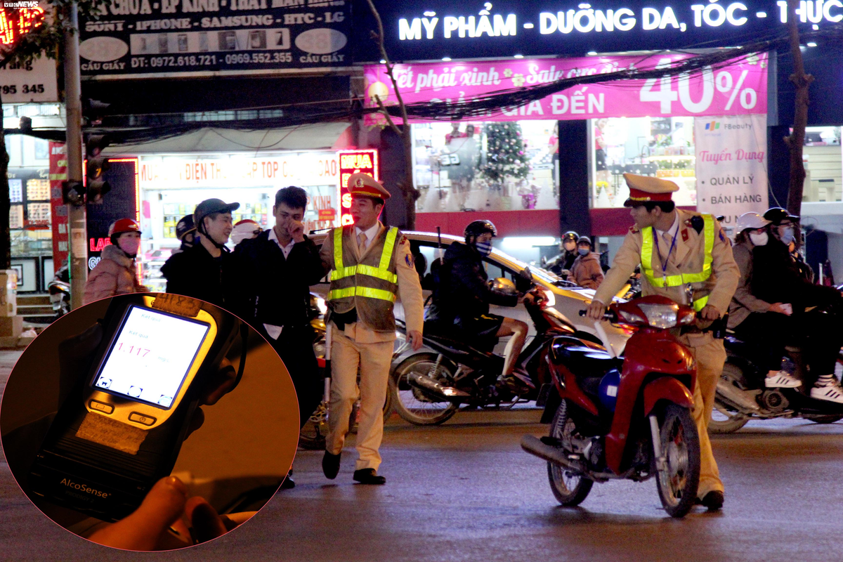 Trong khoảng thời gian từ 20h30 đến 22h30 làm nhiệm vụ tại ngã tư Xuân Thuỷ - Cầu Giấy, tổ công tác lập biên bản xử phạt đối với 5 trường hợp vi phạm nồng độ cồn. Trong đó, trường hợp đặc biệt nhất là 2 nam thanh niên đi ăn tất niên về và say ngất ngưởng còn có thái độ bất hợp tác.