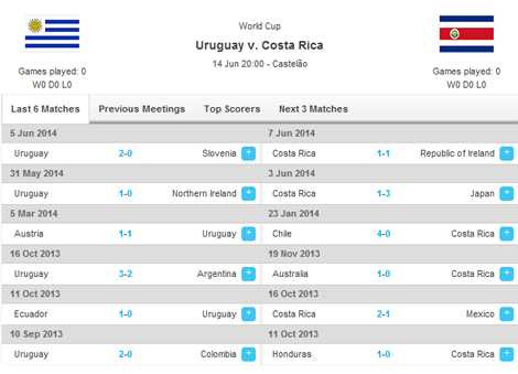 Còn ở 6 trận gần đây, Uruguay có thành tích không tồi khi thắng 4, hòa 1 và thua 1. Trong đó có chiến thắng 3-2 trước Argentina. Ngược lại, Costa Rica chỉ thắng được 1 trong 6 trận gần nhất và để thủng lưới tới 11 bàn.