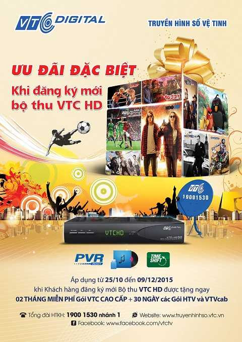 (VTC News) - Cụ thể, từ 25/10 đến 09/12/2015, khi Khách hàng đăng ký mới bộ thu VTC HD sẽ được tặng ngay 02 tháng miễn phí gói VTC Cao cấp và 30 ngày các gói HTV và VTVcab.