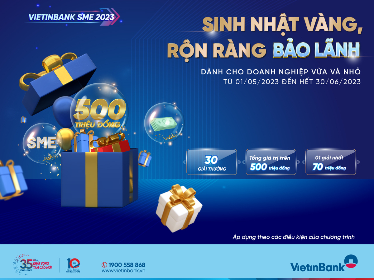 Đăc biệt hơn, từ ngày 1/5 đến hết 30/6/2023, VietinBank dành tặng tất cả các khách hàng doanh nghiệp vừa và nhỏ sử dụng dịch vụ phát hành bảo lãnh với mức phí từ 10 triệu đồng trở lên, có sử dụng dịch vụ ngân hàng số VietinBank eFAST cơ hội tham gia Chương trình quay số trúng thưởng “Sinh nhật Vàng, Rộn ràng bảo lãnh”.