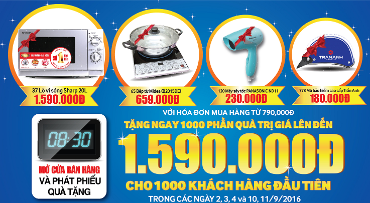 Trong 3 ngày đầu khai trương 2, 3, 4/9/2016, gian hàng QUÀ TẶNG ĐẦU NGÀY với 1000 món quà bao gồm Lò vi sóng, bếp từ, máy sấy tóc… trị giá lên tới 1.590.000đ sẽ được trao tay tới 1000 vị khách hàng đầu tiên may mắn mua hàng với hóa đơn từ 790.000đ.