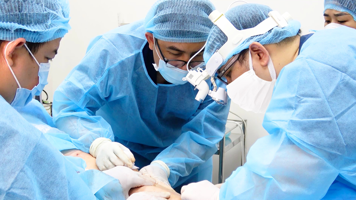 Bác sĩ Phan Duy Kiên cùng đồng nghiệp thực hiện phương pháp EVLA SafeClean điều trị suy giãn tĩnh mạch.