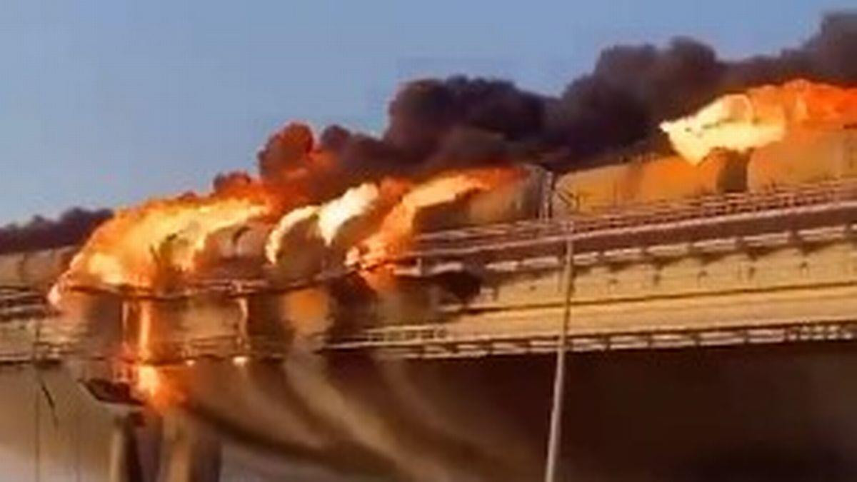 Lửa cháy ngùn ngụt trên cầu Crimea. Ảnh: Mirror