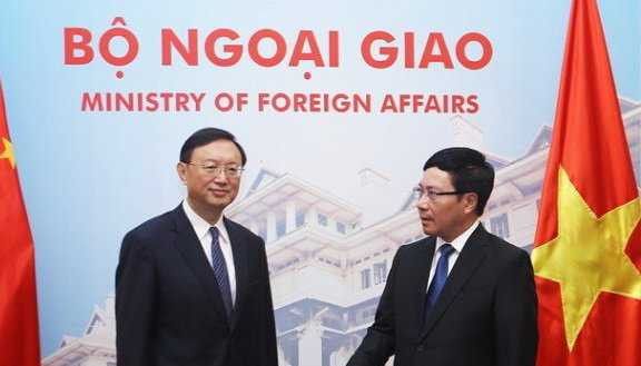 | Phó Thủ tướng kiêm Bộ trưởng Bộ Ngoại giao Phạm Bình Minh (phải) và Ủy viên Quốc vụ Trung Quốc Dương Khiết Trì tại một cuộc hội đàm ở Hà Nội hồi tháng 6/2014 |
