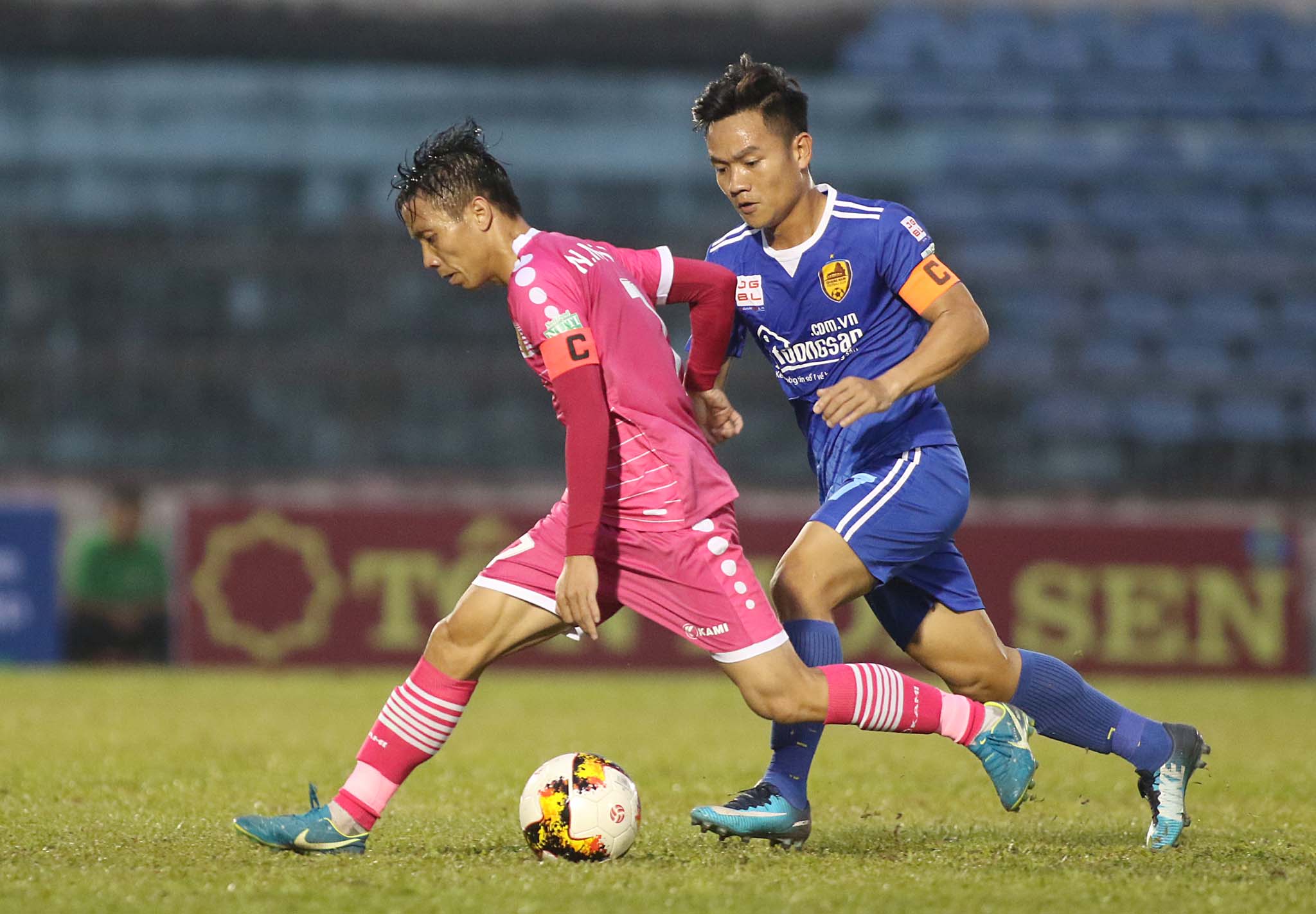 Quảng Nam (áo xanh) đã bị Sài Gòn FC chia điểm trên sân nhà, trong ngày khai mạc NutiCafe V.League 2018 (Ảnh: H.T)