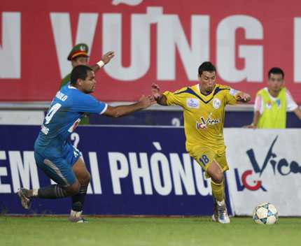 SLNA (áo vàng) quyết bảo vệ lợi thế trong cuộc đua đến ngôi VĐ trước HN T&T. Ảnh: V.S.I