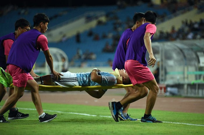 Số 9 của đội bạn sau đó rời sân bằng cáng và được đưa lên xe cấp cứu tới thẳng bệnh viện.