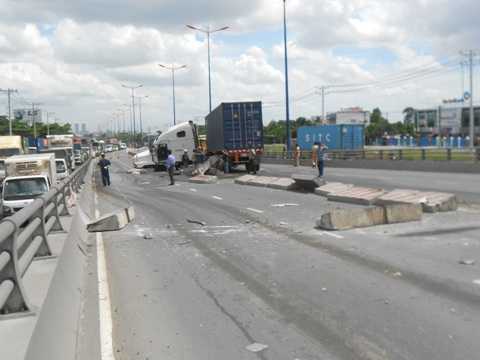 Vụ tai nạn đã khiến hàng chục dải phân cách bị đâm lệnh khỏi hàng, xe container hư hỏng nặng, dầu nhớt chảy tràn đường, giao thông trên Xa lộ Hà Nội bị ùn tắc nghiêm trọng hơn 2 giờ.