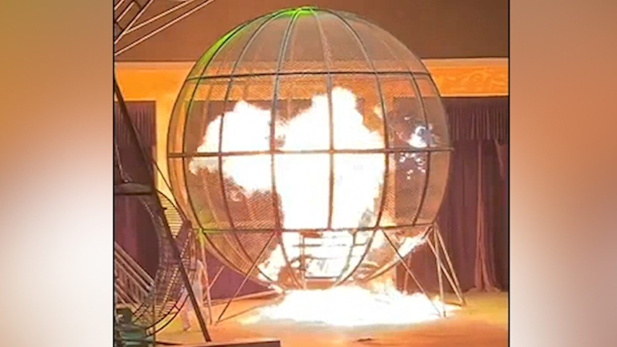 Hai chiếc xe máy đang biểu diễn tại rạp xiếc ở Trung Quốc bất ngờ va chạm khiến một chiếc bốc cháy dữ dội, ngọn lửa bùng lên bao trùm cả quả cầu thép.