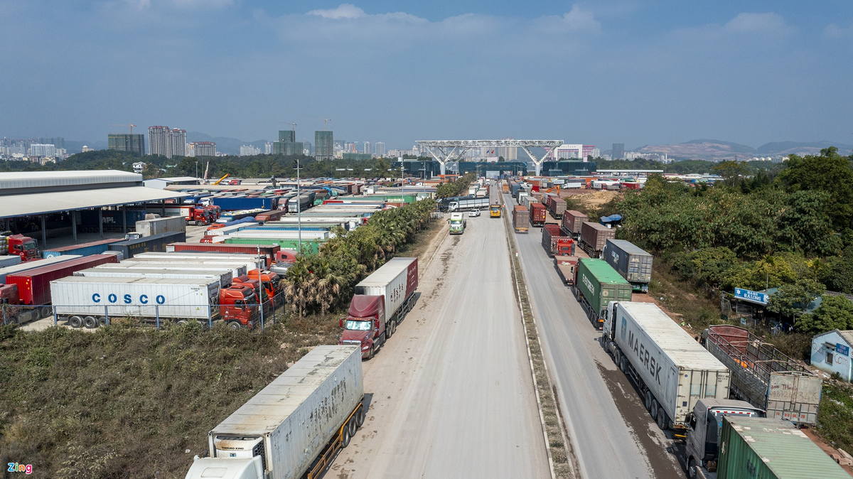 Ghi nhận của Zing, xe container xếp hàng dài gần 3 km chờ qua cửa khẩu Bắc Luân 2. Kho phục vụ kiểm đếm hàng hóa trong tình trạng chật cứng xe container. Nhà chức trách thành phố Móng Cái phải tận dụng bãi đất trống trước cửa khẩu để làm chỗ đỗ xe tạm thời.