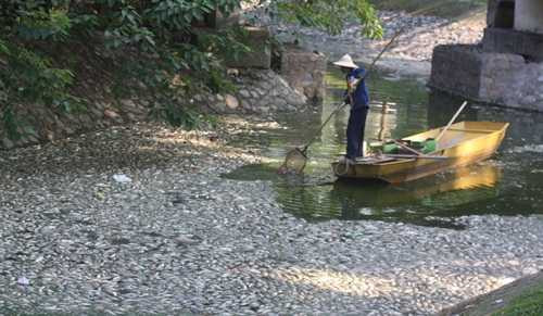 Mỗi ngày, công nhân thu gom vài tạ cá chết tại hồ Thiền Quang