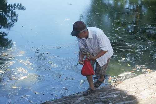 Một công nhân môi trường đang dọn vệ sinh ở hồ Thiền Quang cho biết, mấy ngày hôm nay họ đã rất vất vả thu gom xác cá và chở đi từng chuyến xe ô tô, nhưng cá vẫn tiếp tục chết. Nhiều người dân đã đến khu vực hồ Thiền Quang vớt cá chết về làm thức ăn chăn nuôi.