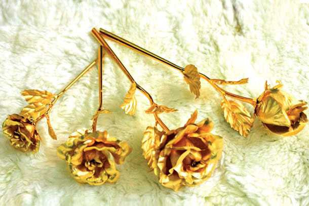 Năm nay, tại nhiều cửa hàng lưu niệm Hà Nội đã nhập loại hoa hồng dát vàng về bán. Mỗi bông hoa hồng bằng vàng là một tác phẩm nghệ thuật độc đáo mà các nghệ nhân đã kỳ công trong từng khâu chế tác. Sự mềm mại, mong manh của từng cánh hồng đã được thể hiện một cách tinh tế, sống động như thật.