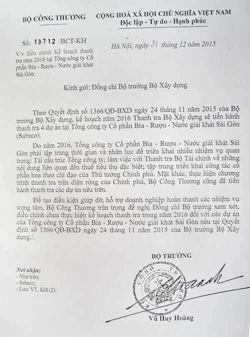 Sở dĩ ông Vũ Huy Hoàng ký công văn này bởi lẽ, trước đó, ngày 24/11/2015, Bộ Xây dựng ban hành Quyết định số 1366/QĐ – KH công bố Kế hoạch thanh tra năm 2016 đối với hàng loạt các Dự án đầu tư xây dựng trên toàn quốc. Nội dung Kế hoạch cũng đã được Tổng thanh tra Chính phủ phê duyệt công khai chuyển đến các cơ quan, đơn vị là đối tượng bị thanh tra. 4 Dự án xây dựng của Sabeco (Tổng Công ty Cổ phần Bia – Rượu – Nước giải khát Sài gòn) thuộc diện cần thanh tra ngay trong Kế hoạch.
