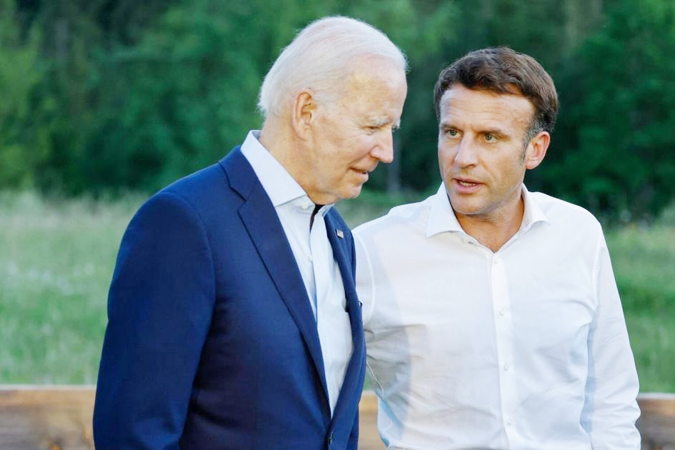 Tổng thống Pháp Emmanuel Macron và người đồng cấp Mỹ Joe Biden (trái) trong một cuộc gặp tại Đức hồi tháng 6/2022. (Ảnh: AFP)