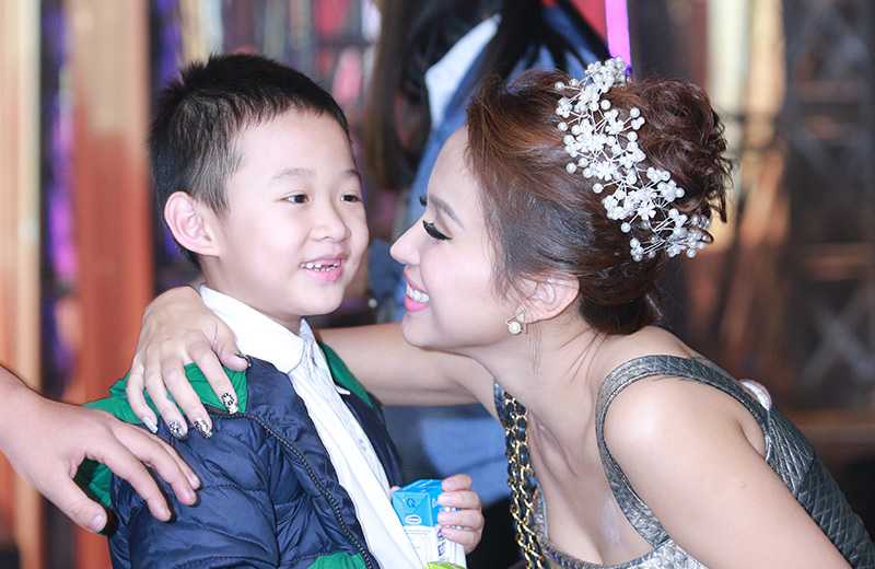 Cô nàng MC xinh đẹp trong bộ váy bồng công chúa dù rất bận rộn nhưng vẫn không quên nhiệm vụ chăm chút cho cu Bin phía sau hậu trường sân khấu.