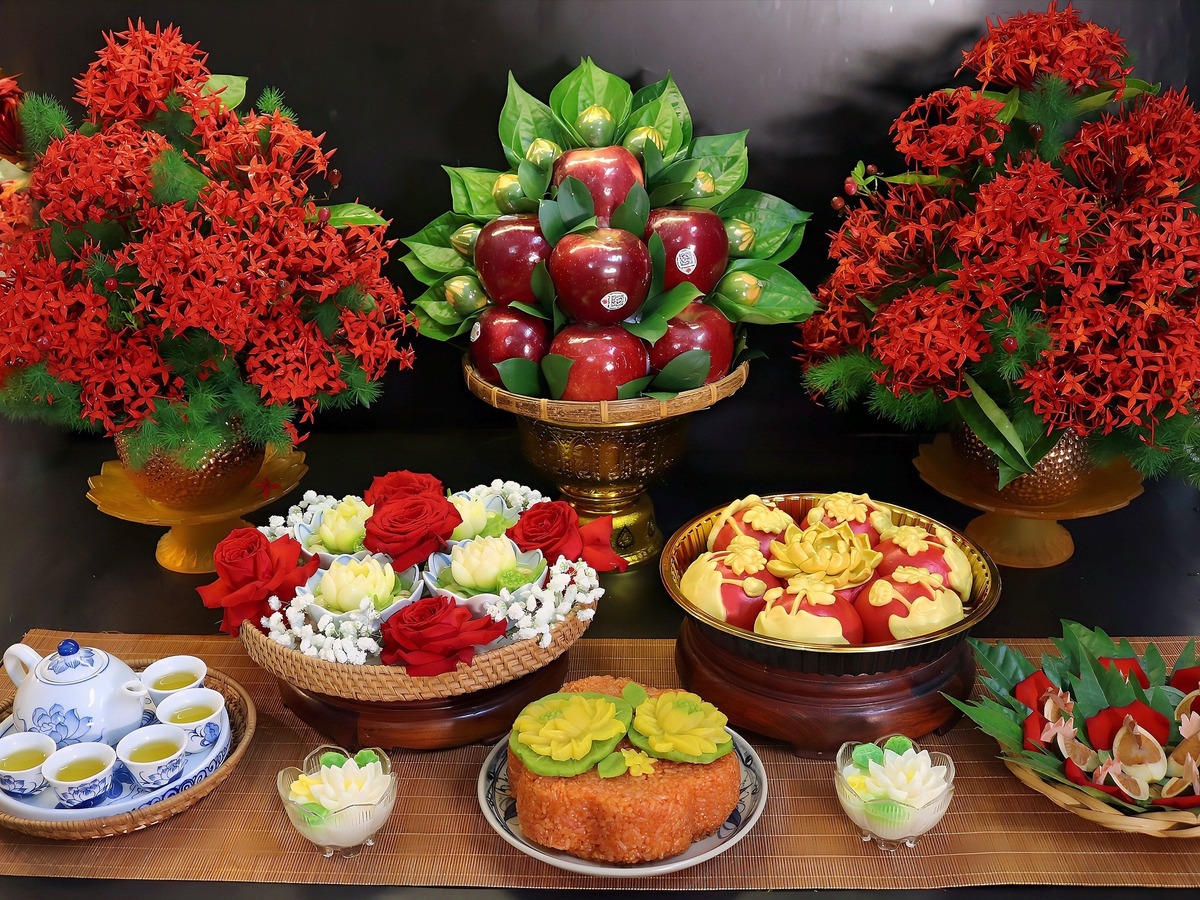 Mâm cúng được chuẩn bị với tất cả tâm huyết và sự chu đáo, không chỉ là sự đầy đủ các lễ vật mà còn chứa đựng ước nguyện chân thành về một khởi đầu mới tràn đầy hy vọng.