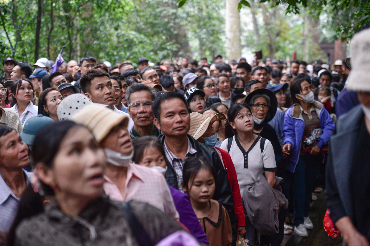 Nhiều người phải dừng lại giữa đường nghỉ lấy sức, số khác bồng bế con nhỏ, lặng lẽ đứng trong dòng người chật kín để chờ tới lượt vào dâng hương.