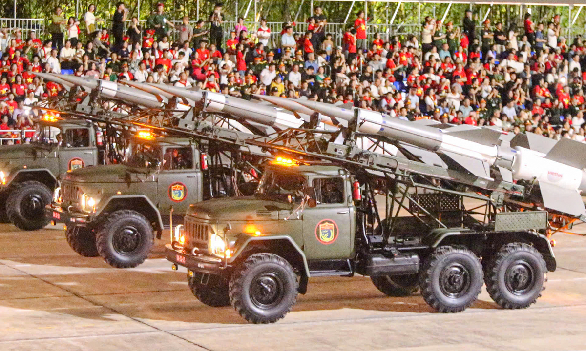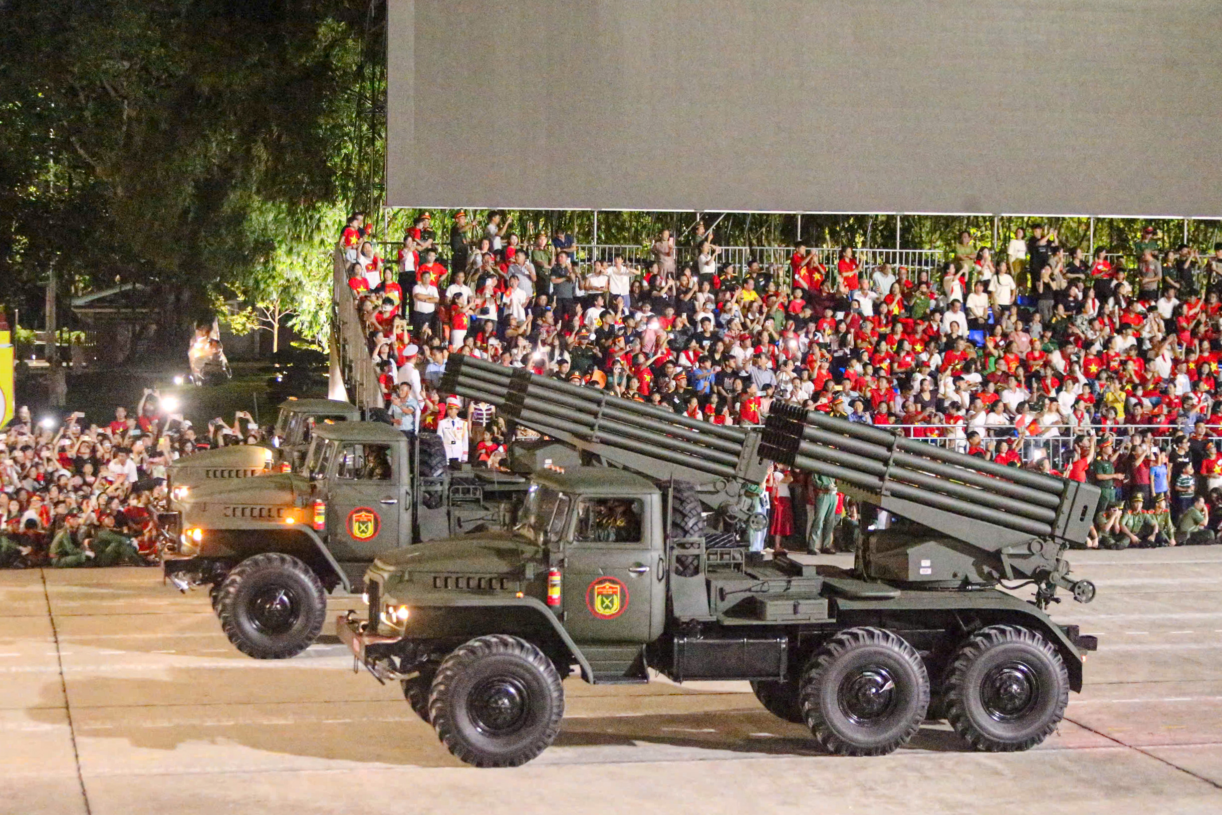 Đi đầu đội hình là dàn pháo phản lực BM-21, mẫu vũ khí có tính cơ động cao, khả năng phóng loạt mạnh mẽ, thể hiện sức mạnh pháo binh Việt Nam.