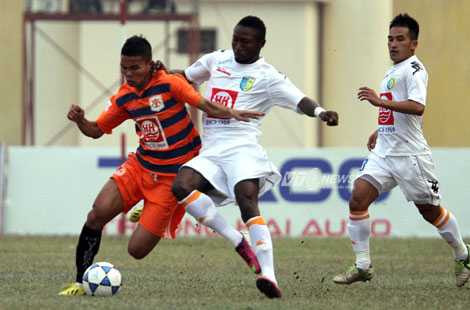 5'. NGUY HIỂM. Hậu vệ V.NB thoáng sơ hở. Hoàng Vũ Samson có cơ hội dứt điểm nhưng không thành công. Pha bóng buộc HLV Nguyễn Văn Sỹ phải bật dậy, nhắc nhở các học trò.