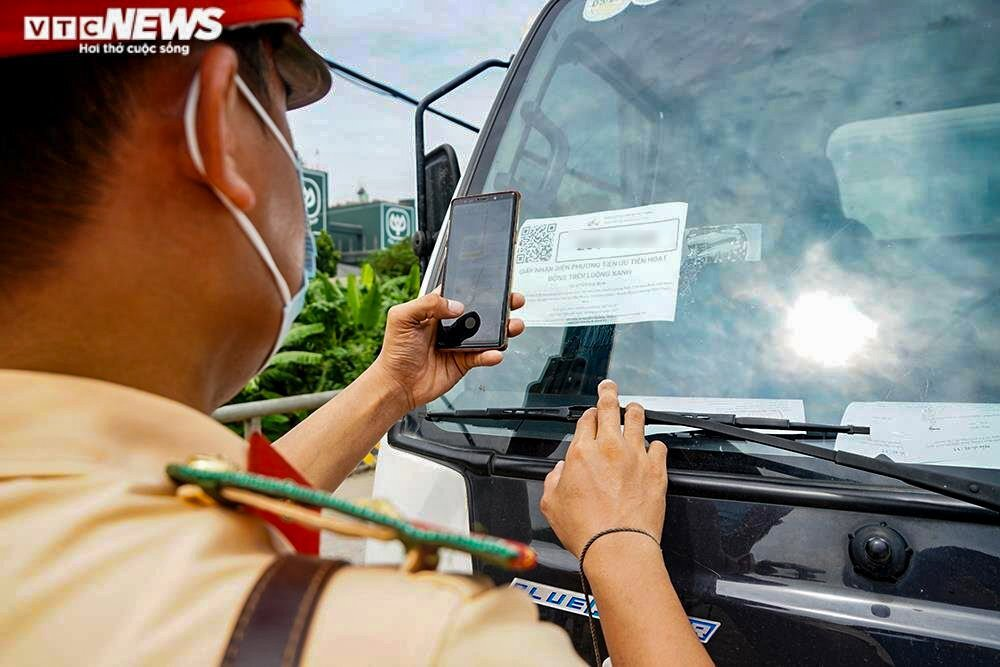 Kiểm tra xe vận tải hàng "luồng xanh" tại chốt kiểm soát dịch. (Ảnh: Thanh Tùng).