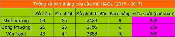 Thống kê thành tích ghi bàn của ba tiền đạo HAGL từ năm 2015 tới 2017.