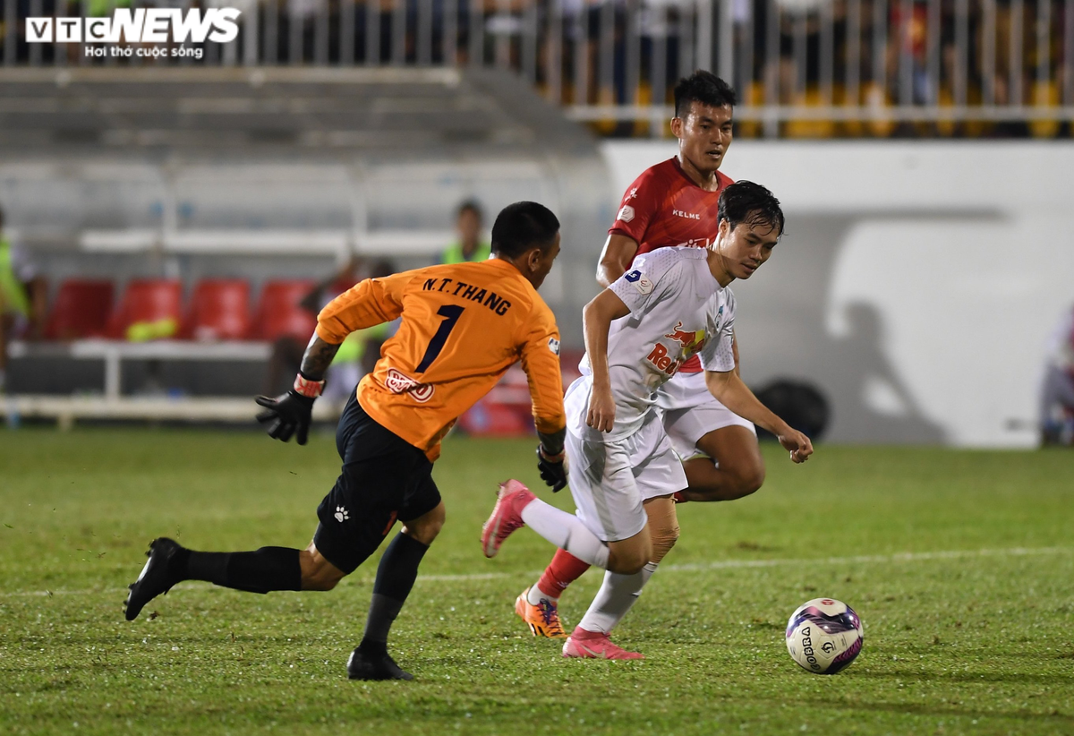 Văn Toàn đi bóng vượt qua thủ môn Thanh Thắng để ghi bàn.