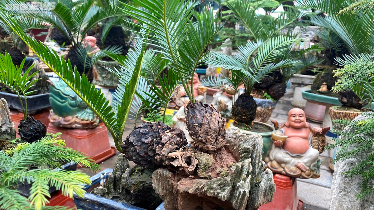 Khoảng hơn 100 cây vạn tuế được bày bán tại sạp nhà ông Dung dịp Tết 2023.
