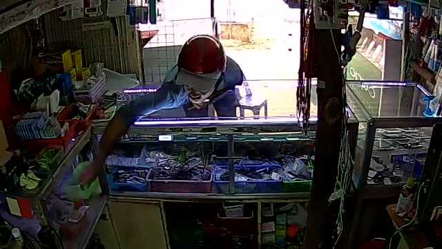 Clip ghi lại cảnh một người đàn ông đội mũ bảo hiểm, vào cửa hàng điện thoại, thấy không có người bèn lấy trộm cả rổ thẻ cào điện thoại rồi nhanh chóng biến mất.