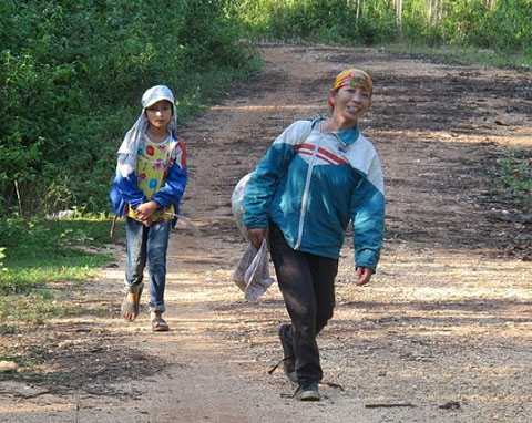 | Cháu Nguyễn Thị Lành theo mẹ vào rừng nhặt hạt dẻ những lúc nghỉ học |