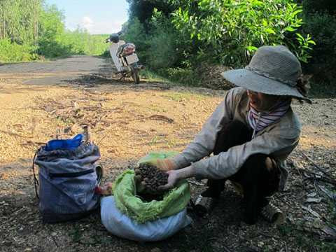 | Thương lái thu mua hạt dẻ của người dân đi nhặt về |