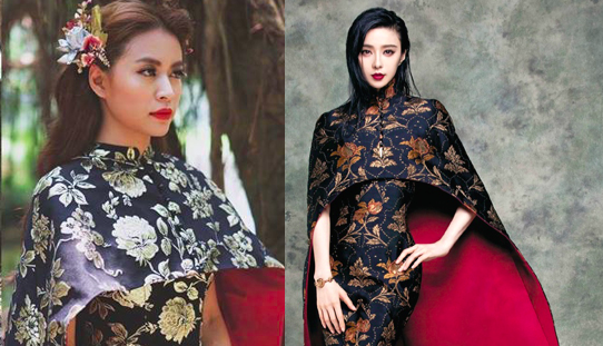 Một trong số bộ váy nữ ca sĩ mặc bị các tín đồ thời trang phát hiện giống thiết kế Phạm Băng Băng từng mặc khi chụp hình cho tạp chí Vogue Đài Loan số tháng 9/2015. Đây là một sáng tạo của nhà mốt Valentino nằm trong bộ sưu tập Couture Thu Đông 2015.