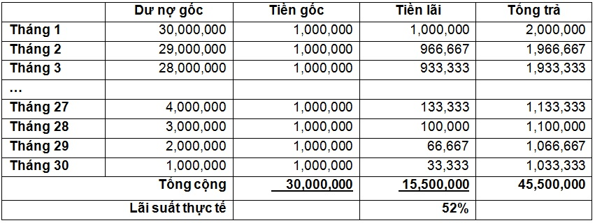 Khách hàng A, trả gốc 1.000.000đ/tháng nợ gốc và trả góp tới 30 tháng, lãi suất thực trả lên đến 52%