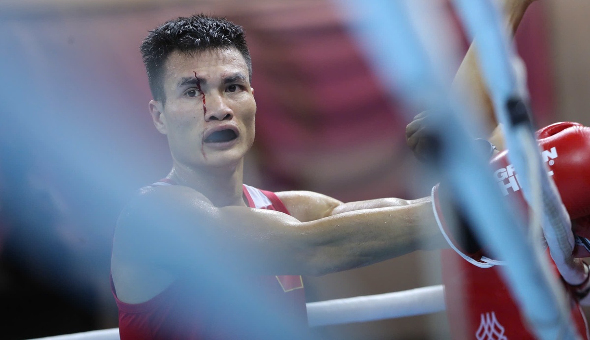 Võ sĩ Việt Nam bị chảy máu ở mặt vì trúng cùi chỏ của đối thủ.