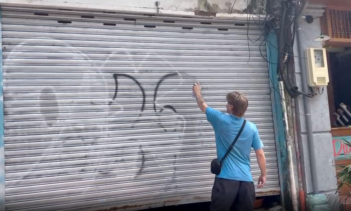 Nam thanh niên người nước ngoài tên R.C.J. bị buộc phải khắc phục hậu quả sau khi vẽ bậy ở trung tâm TP.HCM. (Ảnh: CACC)