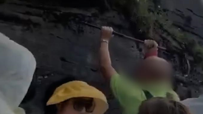 Trong video ghi lại vụ việc diễn ra hồi tháng 7/2021, Trần dùng gậy đi bộ cố viết chữ lên vách núi trước sự chứng kiến của nhiều du khách khác.