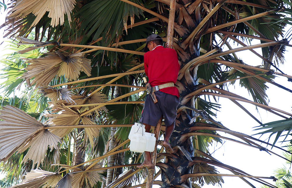 Nước thốt nốt được lấy từ bông chót vót trên cao. Thay cho ống tre thông dụng ngày xưa, bình nhựa có thể đựng được nhiều hơn cho mỗi lần lấy mật.