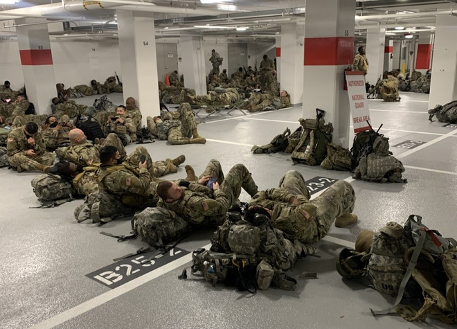 Lính Vệ binh Quốc gia ngủ trong hầm để xe tòa nhà gần Điện Capitol. (Ảnh: Washington Post)