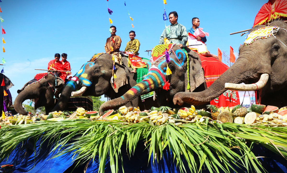 Sau khi thực hiện nghi lễ cúng sức khỏe, những chú voi được dự tiệc buffet hấp dẫn trong ngày hội gồm chuối, mía, dưa hấu...