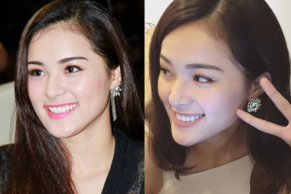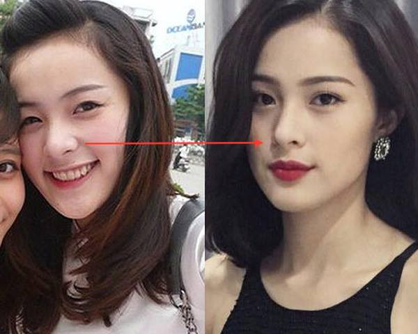 Tiếp đến là sửa mũi, thuở mới vào nghề (ảnh trái) tuy sống mũi của Hạ Vi cao nhưng đầu mũi lại hơi to, nên cô đã chỉnh lại mũi để phần đầu mũi thon gọn và nhẹ nhàng hơn?