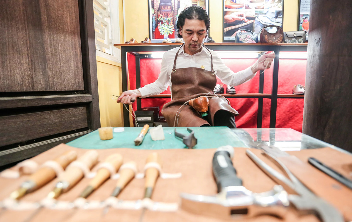 Nghệ nhân Lê Văn Thịnh đang tạo khuân cho đôi giầy. "Để làm một chiếc giầy da, người thợ phải trải qua rất nhiều công đoạn thủ công. Từ việc sử dụng cả khối da liền mảnh, rồi thiết kế phần mũi sao cho mềm mại. Những đôi giầy to thì thường bị thô, nên chúng tôi đã chủ động tỉ mỉ thiết kế các chi tiết trên giầy phải thật tinh tế, kể cả những đường chỉ cũng được khâu cẩn thận, đúng cự ly”.