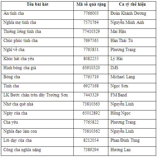Dưới đây là danh sách những bài hát mà teen có thể chọn để gửi tặng cha qua tổng đài 1222 của Viettel.