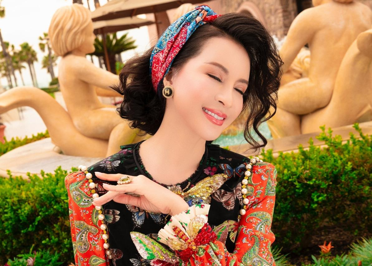 Mẫu váy có họa tiết được tạo nên bằng kỹ thuật đính kết thủ công được MC Thanh Mai đặc biệt yêu thích. Đầm xoè tạo cảm giác bay bổng, cắt may trên vải in nhiều sắc màu nổi bật.