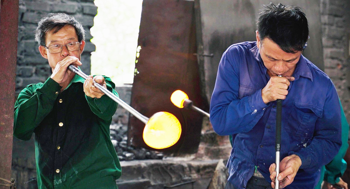 Riêng ông Dương mỗi ngày không dưới 10 giờ vừa trực tiếp làm, vừa kiểm tra hướng dẫn thợ. Mùa hè, nhiệt độ trong xưởng cao, không khác gì “hỏa ngục”. Không ít lần thợ bị bỏng vì sơ ý chạm vào thủy tinh nóng. Có người môi phồng rộp lên vì thổi quá nhiều.